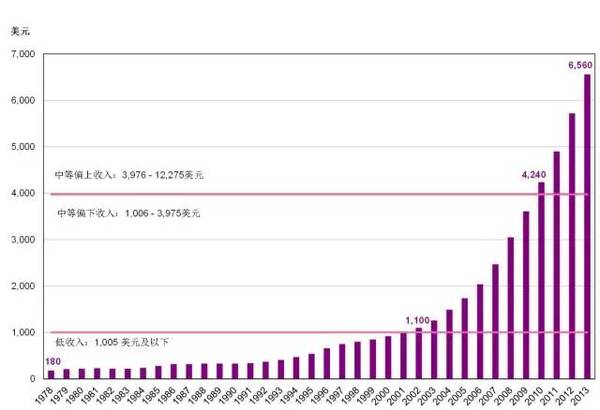 ▲從(cong) 1978至2013年的35年裏,中國國民人均年收入一直在增加