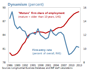 美國經濟活力下降,十年以上的老企業(ye) 雇傭(yong) 員工從(cong) 81%提升到幾乎90%,而新創業(ye) 公司雇傭(yong) 員工從(cong) 16%左右跌到10%,工人不願意換崗,大企業(ye) 雇傭(yong) 越來越多的工人,新成立的企業(ye) 越來越少,表明美國深層次經濟結構和經濟活力的下降,企業(ye) 和個(ge) 人更趨於(yu) 安穩,不願意移動。所以雖然有無數的創新,但是創新從(cong) 來沒有走到企業(ye) 界。這和歐洲的趨勢非常相近。