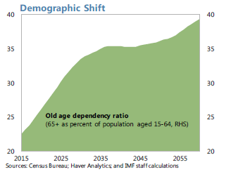 而美國麵臨(lin) 的最大挑戰來自人口老齡化。在經濟學中,人口結構是最為(wei) 關(guan) 鍵的,是無法改變的。65歲以上人口比上15到64歲工作年齡人口的比例,即每個(ge) 勞動人口需贍養(yang) 多少老齡人口,在今年這個(ge) 數據是22%,十年之後將上升10個(ge) 百分點。這將要求勞動生產(chan) 率急劇提高,因為(wei) 贍養(yang) 費用越來越高;還需要投資大幅提高,需要投資來產(chan) 生新的增長點;第三還需要就業(ye) 比率提高。而這三個(ge) 要求,美國都不滿足。