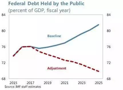 美國的債(zhai) 務占GDP為(wei) 104%,用於(yu) 付息的水平占GDP過去是3%,因為(wei) 利率水平太低,現在降到了2.8%。很有意思的是,美國的借債(zhai) 在過去增加了30%多,美國為(wei) 債(zhai) 務付的利息卻減少了。如果利率上升怎麽(me) 辦?現在正是利率上升期,1個(ge) 百分點的利息上升就意味著美國財政會(hui) 丟(diu) 掉1個(ge) 百分點的GDP開支,這是巨大的數字。所以在利率上升的同時,對美國的財政產(chan) 生了很大的壓力,美國就會(hui) 有債(zhai) 務負擔。美國的財政按照國會(hui) 的要求,會(hui) 逐漸縮小財政赤字,而實際情況是美國的債(zhai) 務在不斷地上升。特別在特朗普時期,債(zhai) 務上升會(hui) 更加快。