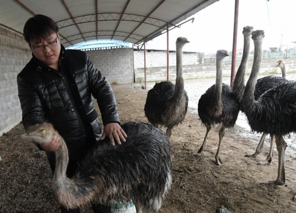 泰州白米鎮鴕鳥養(yang) 殖中心,蘇州大學畢業(ye) 的31歲石正君,正拎著塑料桶一個(ge) 個(ge) 喂養(yang) 並檢查鴕鳥的養(yang) 殖情況。