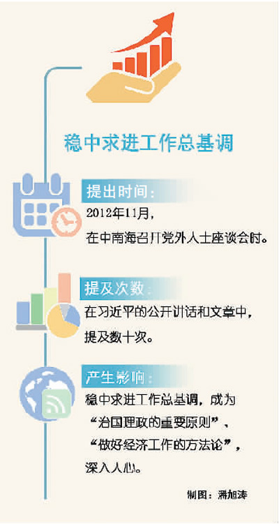 2014年12月1日,習(xi) 近平在中共中央召開黨(dang) 外人士座談會(hui) 時的講話中談到,穩的重點要放在穩住經濟運行上,進的重點是深化改革開放和調整結構。穩和進有機統一、相互促進。經濟社會(hui) 平穩才能為(wei) 深化改革開放和經濟結構調整創造穩定的宏觀環境。2016年12月14日至16日,中央經濟工作會(hui) 議指出,穩是主基調,穩是大局,在穩的前提下要在關(guan) 鍵領域有所進取,在把握好度的前提下奮發有為(wei) 。
