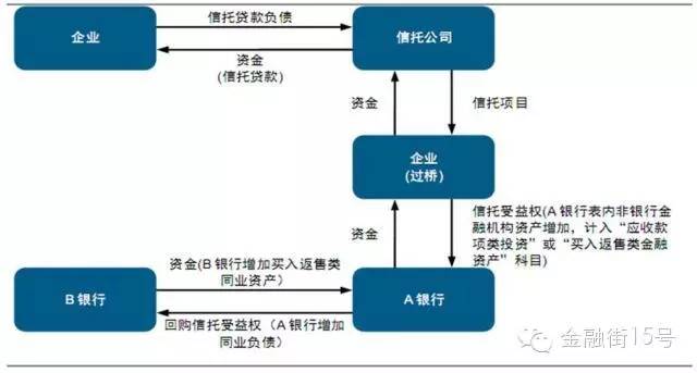 其中,大家非常熟悉的一個(ge) 業(ye) 務是信托收益權的買(mai) 入返售,其操作如圖2所示。B銀行的資金通過A銀行投給過橋企業(ye) ,過橋企業(ye) 可以是證券公司、保險公司、資管計劃,也可以是非金融機構,過橋企業(ye) 再通過信托公司等將資金最終投給資金需求企業(ye) 。中間的這些過渡環節主要是規避銀信合作等限製性監管規定的。