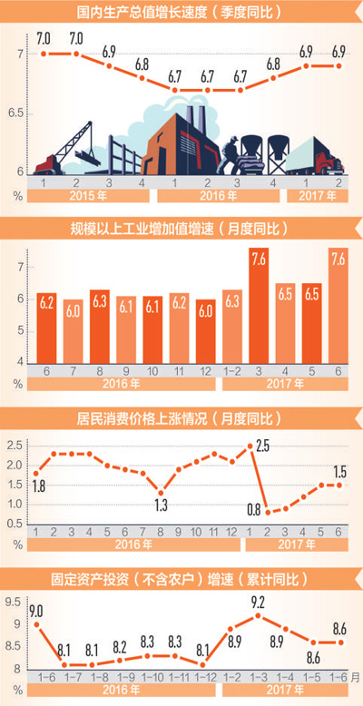 經濟增速保持平穩。上半年我國經濟保持中高速增長,GDP同比增長6.9%,與(yu) 一季度持平,經濟增速連續8個(ge) 季度保持在6.7%—6.9%的區間。
