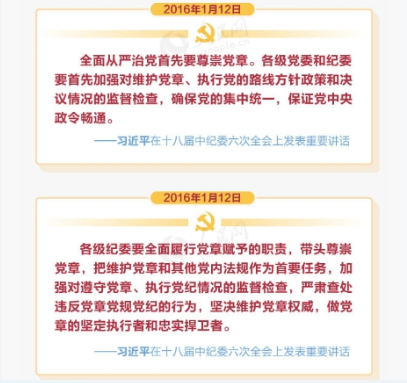嚴(yan) 格黨(dang) 的紀律,維護黨(dang) 的團結統一,必須尊崇黨(dang) 章,維護黨(dang) 章權威。黨(dang) 章是以全黨(dang) 名義(yi) 確定的黨(dang) 內(nei) “共同法律”和“最高法典”,是“一致通過的組織規則”。鄧小平指出,“黨(dang) 章是最根本的黨(dang) 規黨(dang) 法。沒有黨(dang) 規黨(dang) 法,國法就很難保障”。黨(dang) 章的重要功能之一是調整黨(dang) 內(nei) 關(guan) 係、鞏固黨(dang) 的紀律、實現黨(dang) 的目標。黨(dang) 章也是凝聚社會(hui) 力量,讓人們(men) 知所趨赴的公開的旗幟。政黨(dang) 的現代化,體(ti) 現在黨(dang) 有一個(ge) 成熟的綱領,有能力將馬克思主義(yi) 理論與(yu) 時俱進的最新成果和成熟的實踐成果載入黨(dang) 章。尊崇黨(dang) 章、維護黨(dang) 章權威,恪守以黨(dang) 章為(wei) 根本大法的黨(dang) 內(nei) 法規,是確保黨(dang) 始終成為(wei) 社會(hui) 主義(yi) 堅強領導核心根本要求。