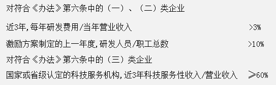 答:根據《辦法》第六條規定,企業(ye) 應建立規範的內(nei) 部財務管理製度和員工績效考核評價(jia) 製度,年度財務會(hui) 計報告經過中介機構依法審計,且激勵方案製定近3年未因財務、稅收等違法違規行為(wei) 受到行政、刑事處罰。成立不滿3年的企業(ye) ,以實際經營年限計算。近3年的財務指標要求如下: