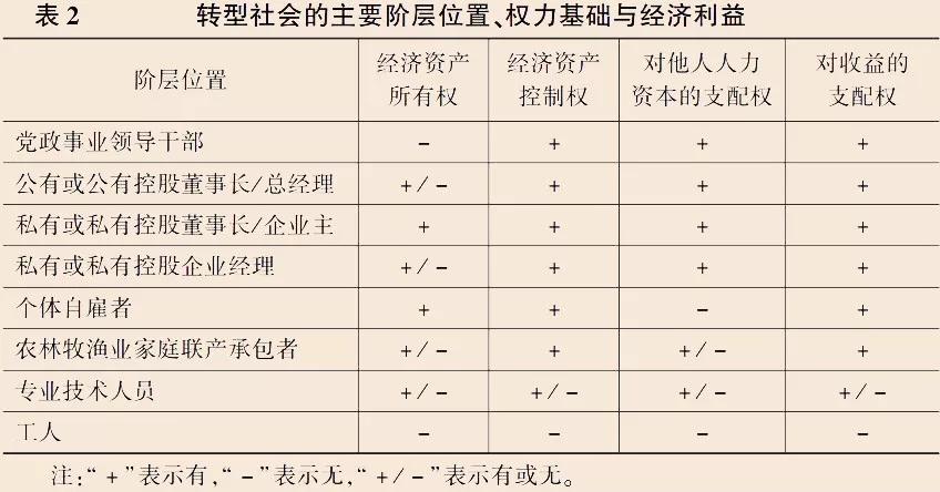 中國計劃經濟時期,實行按勞分配,在改革過程中隨著所有製結構的變化,勞動、資本、技術、管理等要素按貢獻參與(yu) 分配逐漸獲得了合法性。改革中,黨(dang) 中央全會(hui) 報告、國家法律和政府文件,對不同形式的資產(chan) (包括經濟資產(chan) 和人力資本資產(chan) ),不同產(chan) 權所有者的權利(包括收入支配權)的規定逐步革新。比如,十五大報告指出,要著重發展資本、勞動力、技術等生產(chan) 要素市場,完善生產(chan) 要素價(jia) 格形成機製;把按勞分配和按要素分配結合起來。十六大報告確立了勞動、資本、技術和管理等要素按貢獻參與(yu) 分配的原則。十七大報告提出,要健全勞動、資本、技術、管理等生產(chan) 要素按貢獻參與(yu) 分配的製度。十八大報告提出,要完善勞動、資本、技術、管理等要素按貢獻參與(yu) 分配的初次分配機製,提高勞動報酬在初次分配中的比重。這些規則使不同資產(chan) 產(chan) 權所有者、控製者獲得相應收益控製權逐步獲得合法性。表2展示了主要階層位置如何通過經濟資產(chan) 和人力資本產(chan) 權控製而獲取收益支配權。