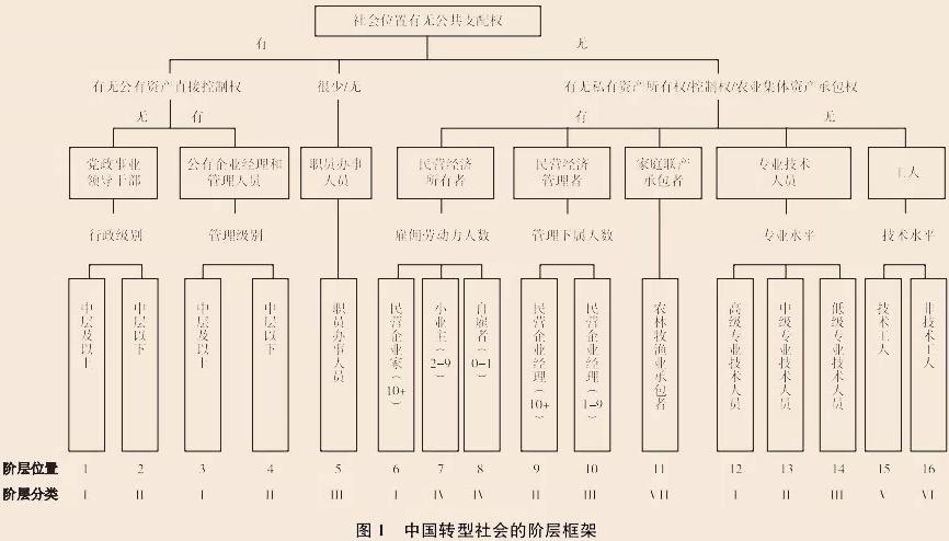 圖1所示階層框架呈現了不同階層間的社會(hui) 關(guan) 係。該框架隱含的基本分類原則是:(1)在權威型支配關(guan) 係中,社會(hui) 位置所擁有的公共支配權(包括公共行政支配權和公有資產(chan) 控製權)大小。(2)在市場型支配關(guan) 係中,社會(hui) 位置所擁有的市場支配權(包括基於(yu) 經濟資產(chan) 產(chan) 權和人力資本產(chan) 權的市場支配權)大小。要強調的是,該階層框架區分的是支配關(guan) 係中的結構性地位,即製度化的、支配權不同的社會(hui) 位置,而不是按支配權大小對個(ge) 人職業(ye) 的歸類。個(ge) 人因占據這些社會(hui) 位置才享有相應的支配權和經濟利益。