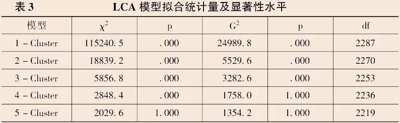 其中,i=1,2,…I,j=1,2,…J,k=1,2,…K,t=1,2,…T。A|X,B|X,C|X分別表示條件概率。上式表明,概率π是潛分類變量X在水平t下和ABC顯變量分別在i,j,k水平下的條件概率的結果。因此,可以根據所估計的條件概率,對潛變量的不同類別的含義(yi) 進行解釋。筆者使用Latent Gold 5.0估計上述模型中的參數。