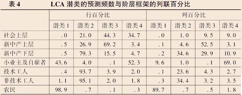 根據所預測的潛分類變量各類別的頻數,可算出潛變量與(yu) 本文所構建的7分類階層的列聯百分比。表4報告了行與(yu) 列百分比。
