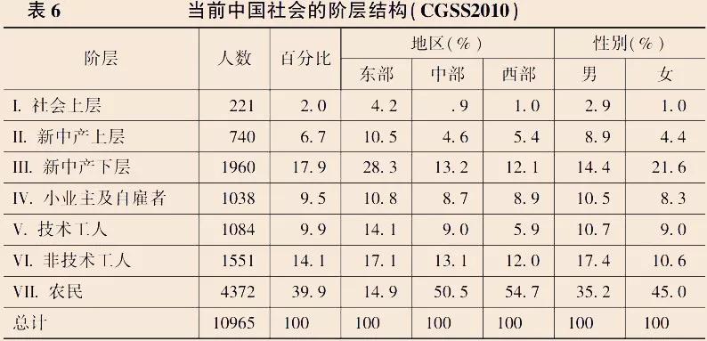 16個(ge) 階層位置歸類後的7個(ge) 階層構成見表6。社會(hui) 上層占2.0%;技術、非技術工人分別約占9.9%、14.1%,二者共占約24.0%。介於(yu) 社會(hui) 上層和勞工階層之間的新中產(chan) 上層占6.7%,新中產(chan) 下層占17.9%,二者共占約24.6%;小業(ye) 主及自雇者(老中產(chan) 階層)占大約9.5%。兩(liang) 類中產(chan) 階層總計約占34.1%。農(nong) 民占39.9%。