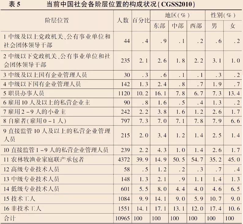 借助圖1所示的階層框架,筆者對CGSS2010資料進行了分析,呈現了各階層位置的比重及其地區和性別差異,結果見表5。