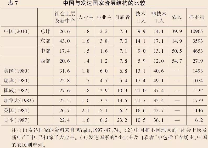 表7比較了中國與(yu) 發達國家的階層結構。結果表明,在私有經濟部門中,當前中國的大中小企業(ye) 主的比重雖不及發達國家,但已與(yu) 之接近;占比大約為(wei) 3%的大中小企業(ye) 主在市場型支配的階層關(guan) 係中居於(yu) 支配地位。中國的公有部門比發達國家有著更龐大的管理者隊伍,他們(men) 行使著公共權力(包括對公有資產(chan) 的支配權和經營收益的支配權),是以現有政治結構和公有產(chan) 權製度為(wei) 基礎的階層關(guan) 係和階層結構的一個(ge) 特征。中國社會(hui) 有著更大的自雇者階層、更龐大的農(nong) 民階層和相對弱小的勞工階層。中國社會(hui) 中以專(zhuan) 業(ye) 技術人員、白領職員為(wei) 代表的新中產(chan) 階層的比重並不低於(yu) 發達國家;小業(ye) 主和自雇者在中國中產(chan) 階層中的比重要高於(yu) 發達國家,是中國中產(chan) 階層中不可忽視的組成部分。中國不同地區間階層構成的差異甚至大於(yu) 與(yu) 發達國家間的差距;東(dong) 部地區的階層結構已與(yu) 發達國家相似,其中產(chan) 化水平甚至比發達國家的總體(ti) 情況還要高。但中西部地區新中產(chan) 階層的比重僅(jin) 占17.4%和20.6%,遠低於(yu) 東(dong) 部地區的43.0%。發達國家的階層結構並非想象中的橄欖型,其勞工階層仍占大多數。在美國社會(hui) 裏,中產(chan) 階級雖在整個(ge) 階層結構中隻占35%-40%,但在大眾(zhong) 傳(chuan) 媒的影響下,人人有向上流動機會(hui) 、消費主義(yi) 等觀念廣為(wei) 人知、深入人心,其結果是使工人階級普遍相信自己是中產(chan) 階級的成員,把美國社會(hui) 想象成了一個(ge) 橄欖型的中產(chan) 階級社會(hui) ,事實上,占大多數的仍然是工人階級(Zweig,2000)。當前中國社會(hui) 的階層結構也非想象中的金字塔型,社會(hui) 上層的比重比發達國家還要大,新中產(chan) 階層的比重也並不低於(yu) 發達國家;但工人階層的規模卻小於(yu) 發達國家,農(nong) 民階層的規模遠遠大於(yu) 發達國家,且中西部地區尤其如此。若要做形象化描述的話,當前,我們(men) 可以用“橄欖型”來描述中國東(dong) 部地區的階層結構、“圭字型”來描述中國中西部地區的階層結構。若不分地區,中國社會(hui) 的階層結構總體(ti) 呈“圭字型”。