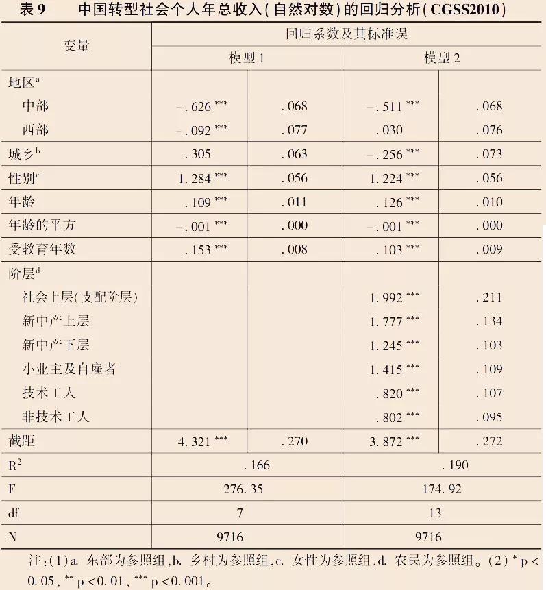 無論是從(cong) 均值還是中位值來看,社會(hui) 上層的收入都是最高的,農(nong) 民的收入都是最低的;社會(hui) 上層的收入高於(yu) 工人階層的收入,新老中產(chan) 階層的收入位居其中。前述假設得到了初步支持。為(wei) 了對假設作更嚴(yan) 格的檢驗,筆者使用多元回歸分析了資料,控製了地區(東(dong) 部、中部或西部)、城鄉(xiang) 、性別、年齡、受教育年數。表9報告了回歸分析結果。
