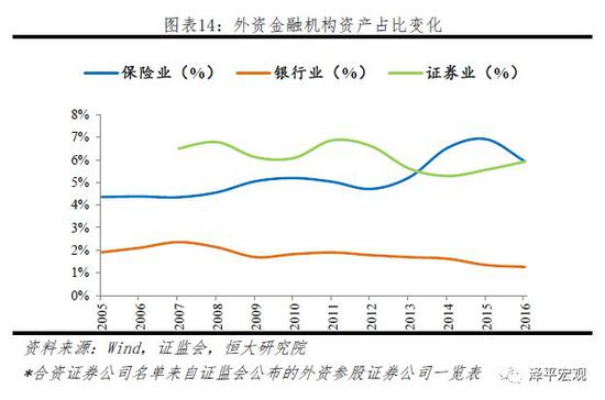 在多種因素製約下,外資金融機構進入我國市場動力不強,多年來其資產(chan) 占比均不足10%。尤其2008年金融危機後,外資機構出售海外資產(chan) 、聚焦本土經營,同時我國加強管製,對審批外資銀行業(ye) 務更嚴(yan) 格,不再發放新的證券經紀業(ye) 務牌照,外資銀行和證券機構占比進一步下降。