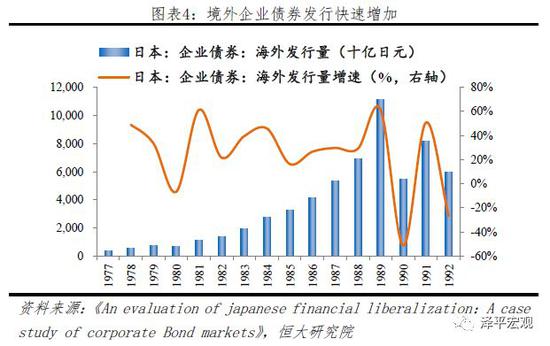 二是日元美元協議後,歐洲日元市場管製放鬆,境外普通債(zhai) 券發行快速增加。1984年允許日本企業(ye) 發行歐洲日元債(zhai) ,1986年允許日本企業(ye) 可以在英國倫(lun) 敦市場發行以美元為(wei) 單位的信用債(zhai) 和可轉債(zhai) ,截止1989年,日本境外企業(ye) 債(zhai) 發行量相比1984年增加了3倍,總額達11.13萬(wan) 億(yi) 日元。80年代後期,一方麵國內(nei) 利率市場化進度緩慢,金融監管嚴(yan) 格,另一方麵,匯率製度基本形成自由浮動匯率,資本項下可兌(dui) 換基本放開,此外離岸市場管製放鬆,多方麵因素作用下,日本企業(ye) 在海外發債(zhai) 快速增加,而購買(mai) 者也常常是日本境內(nei) 金融機構,衝(chong) 擊國內(nei) 正常融資市場,金融結構扭曲。