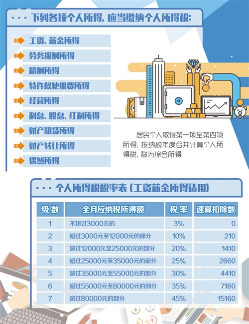 新個(ge) 稅法結合當前征管能力和配套條件等實際情況,將工資、薪金所得,勞務報酬所得,稿酬所得,特許權使用費所得等4項勞動性所得(稱為(wei) “綜合所得”)納入綜合征稅範圍,適用統一的超額累進稅率,居民個(ge) 人按年合並計算個(ge) 人所得稅。