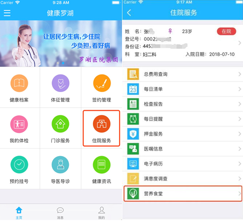 食品衛生、食品安全是全民關(guan) 注的焦點,對住院患者更為(wei) 重要,為(wei) 解決(jue) 住院患者及其陪護人員訂餐、用餐問題,更是為(wei) 給患者提供安全、衛生、新鮮的餐飲,羅湖醫院集團在“健康羅湖”APP上推出智慧餐飲功能(如圖四所示)。住院患者及其陪護人員可通過手機掃描床頭二維碼或通過健康羅湖APP自助訂餐,針對糖尿病、高血壓等有特殊用餐需求的患者提供相應的低糖、低鹽等營養(yang) 餐,訂餐支持微信、支付寶支付,且可以在線查詢訂單詳情及消費明細,訂餐記錄可追溯,而訂餐配送模式解決(jue) 了患者及其陪護人員活動範圍及時間受限的問題,提升患者滿意度。
