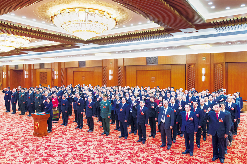 2018年3月18日,十三屆全國人大一次會(hui) 議在北京人民大會(hui) 堂舉(ju) 行第六次全體(ti) 會(hui) 議。圖為(wei) 新當選的第十三屆全國人民代表大會(hui) 常務委員會(hui) 委員進行憲法宣誓。 新華社記者 李學仁/攝