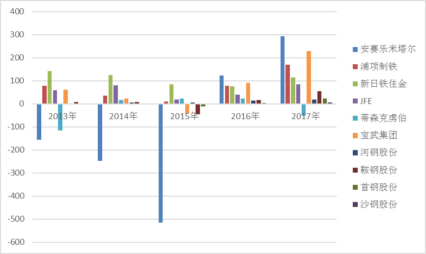 從(cong) 淨利潤看,除寶武集團外,我國鋼企低於(yu) 世界一流水平(見圖表3)。從(cong) 淨利潤和淨利潤變化兩(liang) 個(ge) 角度看,寶武集團與(yu) 新日鐵住金、浦項製鐵、JFE為(wei) 第一陣營,具有利潤高且穩定特點;安賽樂(le) 米塔爾利潤高但不穩定,為(wei) 第二陣營;鞍鋼股份、河鋼股份與(yu) 蒂森克虜伯為(wei) 第三陣營,利潤較低。