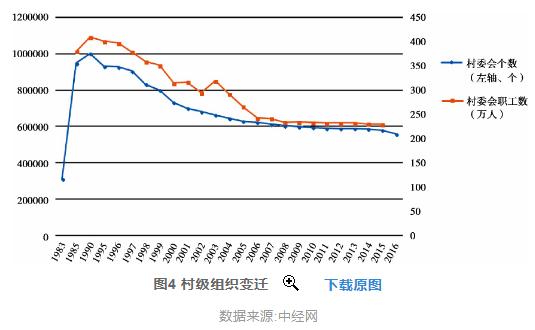 三是村級組織正式化。隨著民生建設和維穩工作量的增大以及村級財務支付由財政支出負責,村級幹部不斷正規化和崗位化。村級幹部中非村民幹部越來越多,包括各級政府委派的大學生村官或下派的政府工作人員;稅費改革後,村幹部工資主要由財政直接負擔,村級組織主要幹部的工資實行由鄉(xiang) 鎮核定年薪製,其他幹部實行補貼製,村級組織幹部工資補貼不得低於(yu) 當地農(nong) 民收入平均水平。除工資外,村級組織辦公經費也由財政給付。村級組織的正式化,導致國家負擔村級組織運行的成本越來越高,由此加劇大規模拆村並組,村委會(hui) 個(ge) 數及其職工數從(cong) 1990年的1001272個(ge) 、409.4萬(wan) 人減少到2015年的580856個(ge) 、229.71萬(wan) 人,年均分別減少了2.2%和2.34%(見圖4)。
