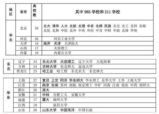 這一差異,也反映在高等教育資源的分配上。作為(wei) 中國的教育中心,北京的985和211高校數量達到23所,而相鄰的河北省,僅(jin) 有一所211大學——河北工業(ye) 大學。