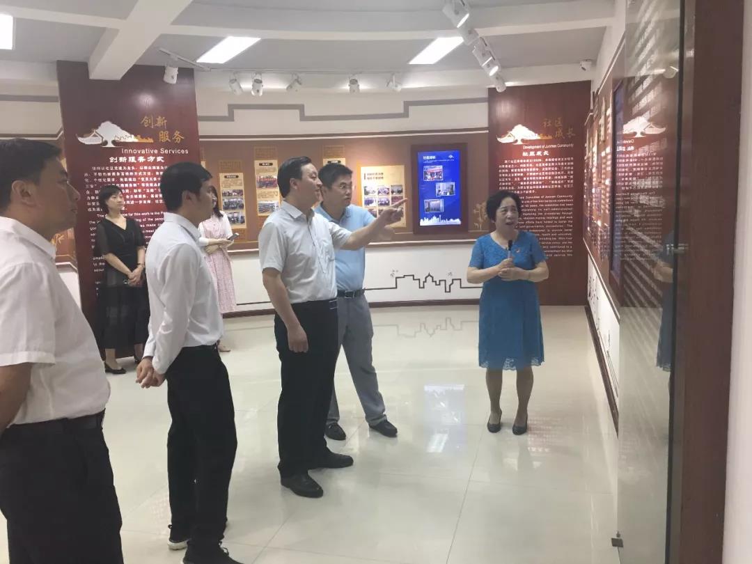 中國經濟體(ti) 製改革雜誌社社長潘治宏(左三)在福建省委改革辦常務副主任薛侃(左四)、福州市委改革辦常務副主任張永森(左二)和福州市鼓樓區委書(shu) 記朱訓誌(左一)陪同下,調研組在軍(jun) 門社區居委會(hui) 沿革館了解社區發展情況。