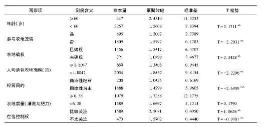 注:*、**、***分別為(wei) 0.1、0.05、0.01水平上有顯著差異(雙側(ce) );農(nong) 戶人均耕地麵積、農(nong) 地質量以及地塊數,均以均值作為(wei) 分組標準;在位控製權指農(nong) 戶是否關(guan) 注或在意農(nong) 地轉出後如何被使用。問卷采用“比較關(guan) 注、一般、不太關(guan) 注”的三級評價(jia) 。其T值檢驗,“比較關(guan) 注”與(yu) “不太關(guan) 注”均是相對“一般”而言的;由於(yu) 部分農(nong) 戶未能回答所有問項,因此每個(ge) 觀察項的樣本量加總並不總是為(wei) 2704個(ge)