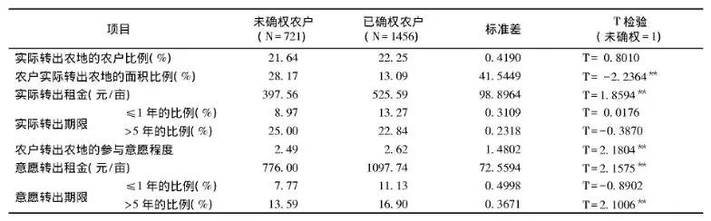 表2 土地確權狀況與(yu) 農(nong) 戶農(nong) 地轉出行為(wei) 及意願的比較
