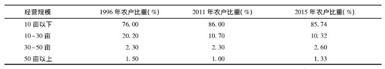 注:1996年數據為(wei) 全國農(nong) 村固定觀察點農(nong) 戶調查數據;2011年、2015年數據來源於(yu) 農(nong) 業(ye) 部經管司編:《全國農(nong) 村經營管理資料》(2011,2015)