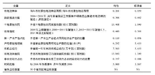 一是因變量。因變量為(wei) 農(nong) 地流轉率,采用當年農(nong) 戶承包地流轉總麵積與(yu) 占當年農(nong) 村承包地總麵積的比值來刻畫。