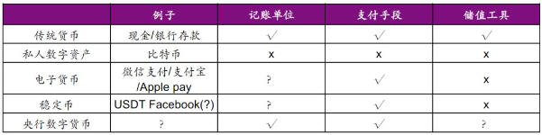 比較下大家關(guan) 注的可能的數字貨幣形式,從(cong) 貨幣的三大功能——記賬單位、支付手段和儲(chu) 值工具來看,滿足了什麽(me) 樣的要求。
