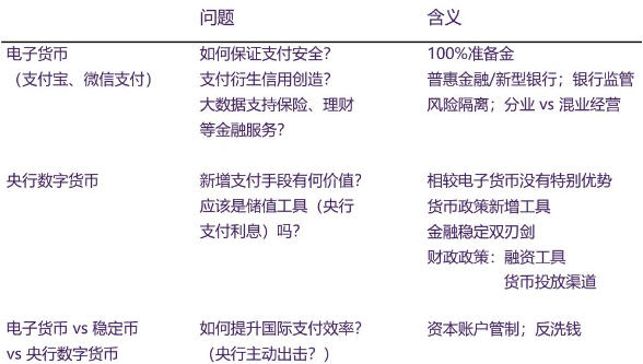 最後就是央行數字貨幣,還沒有發生,但是討論很多。央行數字貨幣是央行發行的,所以是記賬單位,由此起到支付手段的作用,它是不是儲(chu) 值工具呢?需要畫一個(ge) 問號,那要取決(jue) 於(yu) 央行對它的數字貨幣是不是支付利息,如果支付利息,對其持有人來講央行數字貨幣就是類似銀行存款的流動性資產(chan) 。