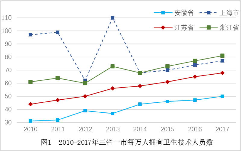 圖1反映了三省一市每萬(wan) 人擁有衛生技術人員的數量。在2010-2017年間,上海在2014年之前波動較大,隨後進入緩慢增長趨勢;浙江、江蘇、安徽則均處於(yu) 增長態勢。其中,2014年之後,浙江省每萬(wan) 人擁有衛生技術人員的數量在長三角躍居首位,而安徽的該指標一直居於(yu) 末位,同時增長也較為(wei) 緩慢。與(yu) 此同時,區域交通的發達增加了病人的流動。以複旦大學附屬腫瘤醫院2018年數據為(wei) 例,82.2%的門診病人來自長三角地區,79.1%的手術病人來自長三角地區。其中來自江浙皖三省的門診病人占醫院門診總人數的39.1%,手術病人占比達到58.6%,長三角患者來滬就診“紮堆”傾(qing) 向在增加。因此,進一步構建跨區域的多單位聯合醫療服務,是實現長三角醫療資源共享共建的解決(jue) 路徑。