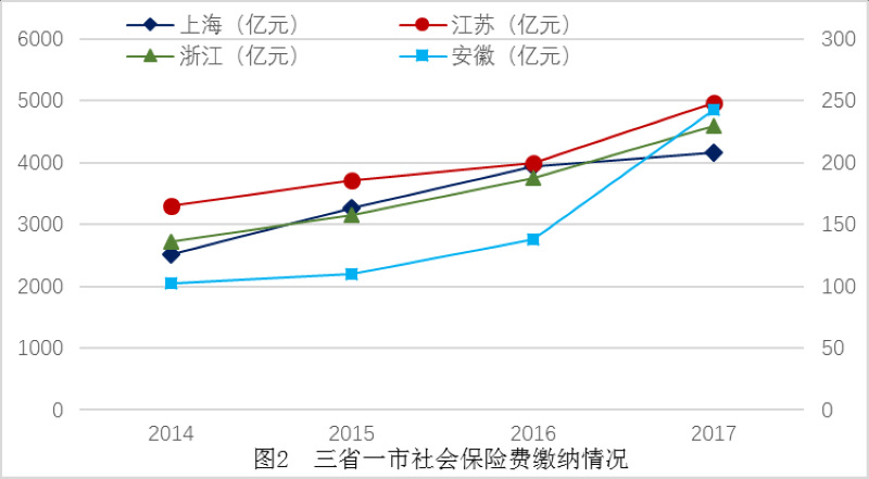 圖2為(wei) 三省一市社保費繳納情況。總體(ti) 規模是增加的,從(cong) 支付社會(hui) 保險費來看比較樂(le) 觀,但也說明企業(ye) 承擔了較重的社會(hui) 保險負擔。具體(ti) 情況還要看企業(ye) 繳納比例以及繳費基數的變化。就目前情況看,上海的企業(ye) 繳費基數和規模居三省一市之首,同時三省一市的繳費機製也有所差別。後續如何協調統一,並且不增加企業(ye) 成本是另一個(ge) 財政領域的難點問題。