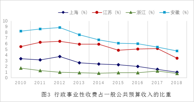 行政事業(ye) 性收費是指國家機關(guan) 、事業(ye) 單位、代行政府職能的社會(hui) 團體(ti) 及其他組織根據法律、行政法規、地方性法規等有關(guan) 規定,依照國務院規定程序批準,在向公民、法人提供特定服務的過程中,按照成本補償(chang) 和非盈利原則向特定服務對象收取的費用。行政事業(ye) 性收費項目數在逐年減少,但是目前涉及項目仍然過多,涉企行政事業(ye) 性收費給企業(ye) 帶來了較大負擔。圖3為(wei) 長三角地區三省一市2010年到2018年行政事業(ye) 性收費占當地一般公共預算收入的比重變化情況。
