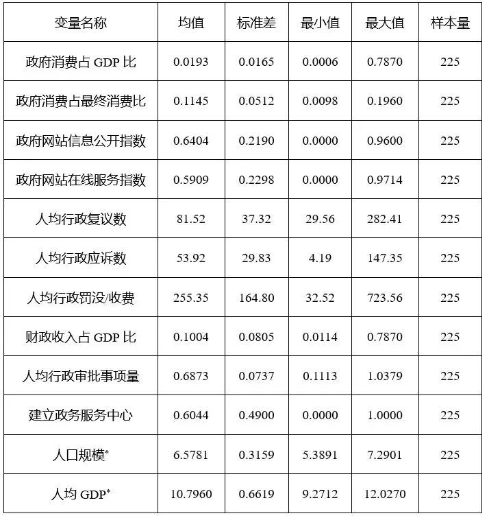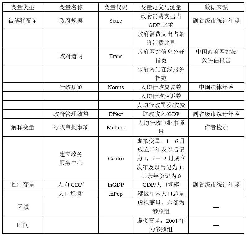 被解釋變量地方政府績效的相關(guan) 數據來源於(yu) 各城市年度統計年鑒、《中國政府網站績效評估報告》和《中國法律年鑒》;解釋變量行政審批事項與(yu) 政務服務中心相關(guan) 數據通過檢索政府官網、行政審批中心網以及市政府文件與(yu) 工作報告、政府令與(yu) 函等途徑獲取,並輔之以新聞媒體(ti) 報道進行搜尋。所有數據均來自公開的二手數據,可確保其真實性與(yu) 客觀性。