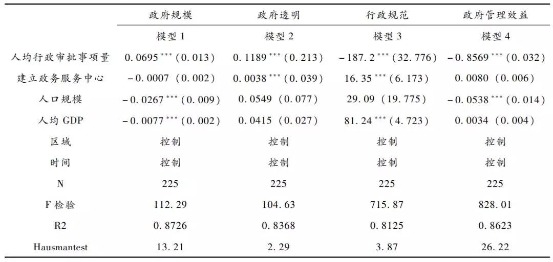 表4報告了主要變量相關(guan) 性統計分析結果。可以看出,人均行政審批事項與(yu) 政府規模呈正相關(guan) 關(guan) 係,與(yu) 行政規範、政府管理效益呈負相關(guan) 關(guan) 係,與(yu) 政府透明的相關(guan) 關(guan) 係不顯著;建立政務服務中心與(yu) 政府規模負向相關(guan) ,與(yu) 行政規範、政府管理效益正向相關(guan) ,與(yu) 政府透明相關(guan) 關(guan) 係不顯著。