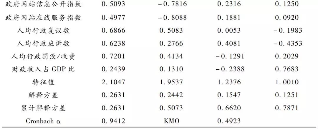 基於(yu) 主成分分析法對被解釋變量進行因子分析,各變量因子載荷如表3所示。據此,將公因子1命名為(wei) 行政規範,將公因子2命名為(wei) 政府透明,將公因子3命名為(wei) 政府規模,將公因子4命名為(wei) 政府管理效益。[1]