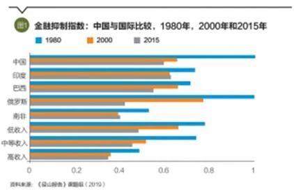 1978年底,中國隻有一家主要金融機構,即兼具商業(ye) 銀行和中央銀行責任的中國人民銀行。40年以後的今天,中國已經發展出一個(ge) 機構數量眾(zhong) 多、資產(chan) 規模龐大的金融體(ti) 係。但這個(ge) 體(ti) 係還有一個(ge) 重要的特征就是政府依然保持著對利率、匯率、資金配置、大型金融機構和跨境資本流動的頻繁幹預。雖然金融抑製指數從(cong) 1980年的1.0降到了2015年的0.6,表明市場化的進程也在推進,但當前中國的金融抑製的水平,依然居於(yu) 世界高位(如圖1所示)。