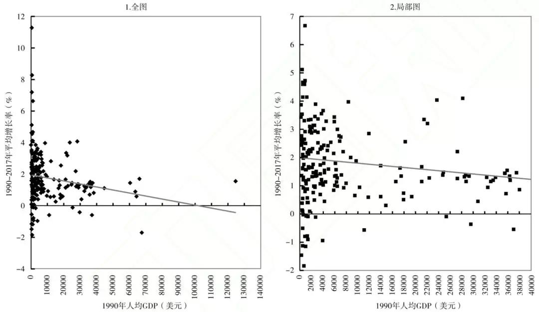 首先,如圖1所示,1990年人均GDP與(yu) 1990—2017年期間年均增長率之間的關(guan) 係,雖然具有一條負斜率的趨勢線,即總體(ti) 表現出趨同的傾(qing) 向,但是兩(liang) 個(ge) 變量之間的相關(guan) 係數並不顯著,即存在著大量的國家,其經濟增長速度與(yu) 自身的初始收入水平並不具有符合預期的聯係。由此得到的啟示是,大趨勢中總是存在著變異,就單一國家或地區來說,呈現出異於(yu) 眾(zhong) 數規律的個(ge) 性化結果也屬必然。