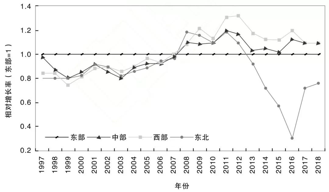 以東(dong) 部地區GDP年均增長率為(wei) 基準,我們(men) 可以發現,從(cong) 開始實施區域均衡發展戰略直到2012年,中西部地區和東(dong) 北地區都處於(yu) 趕超東(dong) 部地區的發展態勢之中。隻是在2012年中國經濟整體(ti) 明顯減速之後,在中西部地區仍然保持較之東(dong) 部地區更高的相對增長率的同時,東(dong) 北地區經濟增長速度下行更為(wei) 顯著,相對增長率大幅度下降(圖4)。這就是為(wei) 什麽(me) 社會(hui) 各界高度關(guan) 注“新東(dong) 北現象”的原因。應該說,對東(dong) 北經濟進行過認真研究的人們(men) ,並不是想得出東(dong) 北經濟衰落的結論,也不應該沿襲傳(chuan) 統觀念探討東(dong) 北振興(xing) 之路,而需要找到東(dong) 北經濟再振興(xing) 的新機遇和新思路。