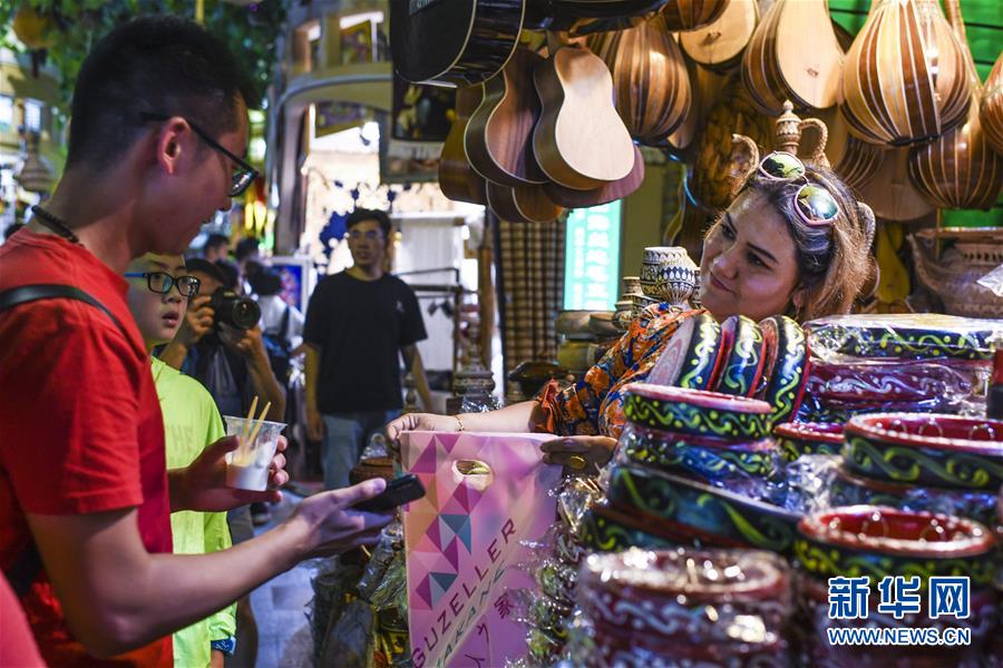 在位於(yu) 烏(wu) 魯木齊的大巴紮景區,遊客在觀光購物(8月8日攝)。 新華社記者 王菲 攝