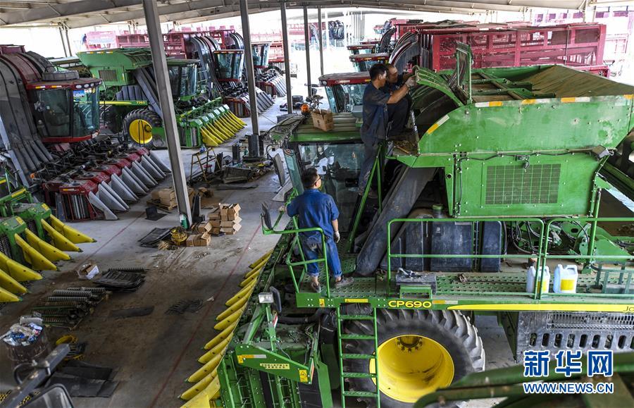在位於(yu) 新疆生產(chan) 建設兵團第六師五家渠市的新疆準噶爾銀豐(feng) 農(nong) 機裝備有限公司內(nei) ,檢修人員在檢修保養(yang) 采棉機(7月31日攝)。 新華社記者 王菲 攝