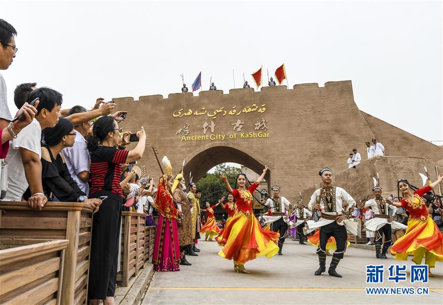 遊客在新疆喀什古城景區開城儀(yi) 式上觀看歌舞表演(8月13日攝)。