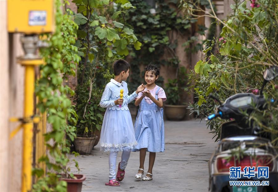 在新疆喀什古城景區內(nei) ,當地兩(liang) 名小朋友走在巷道內(nei) (8月12日攝)。新華社記者 王菲 攝
