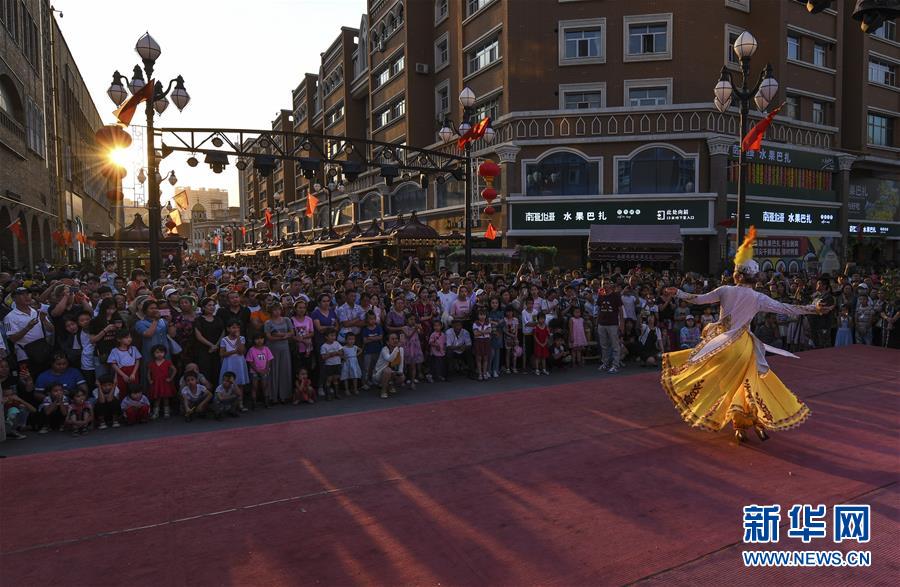 在位於(yu) 烏(wu) 魯木齊的大巴紮景區,遊客在觀看歌舞演出(7月24日攝)。新華社記者 王菲 攝