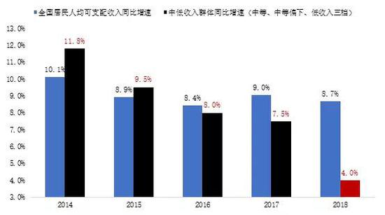而低收入群體(ti) 購買(mai) 力有限,對於(yu) 彩票的投入較少;高收入群體(ti) 生活富裕,對於(yu) 參與(yu) 彩票活動的積極性明顯偏弱。根據國家統計局公布的五檔收入群體(ti) 的收入增速,可以很清晰的發現,2018年中低收入群體(ti) 的增速隻有4%,明顯低於(yu) 全國平均水平,且逐年走低,這必然會(hui) 對彩票銷售增速形成一定的壓製。