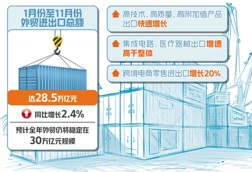 ——規模上穩中求進。前11個(ge) 月,外貿進出口總額達到了28.5萬(wan) 億(yi) 元,同比增長2.4%,預計全年外貿仍將穩定在30萬(wan) 億(yi) 元規模。從(cong) 國際比較來看,中國出口增速高於(yu) 全球主要經濟體(ti) 整體(ti) 水平。