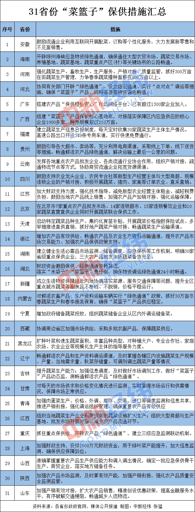 在地方層麵上,31省份通過鼓勵農(nong) 產(chan) 品線上銷售、暢通運輸“綠色通道”、抓好產(chan) 品產(chan) 銷對接、加大財政支持力度等措施全力守護民眾(zhong) 的“菜籃子”。